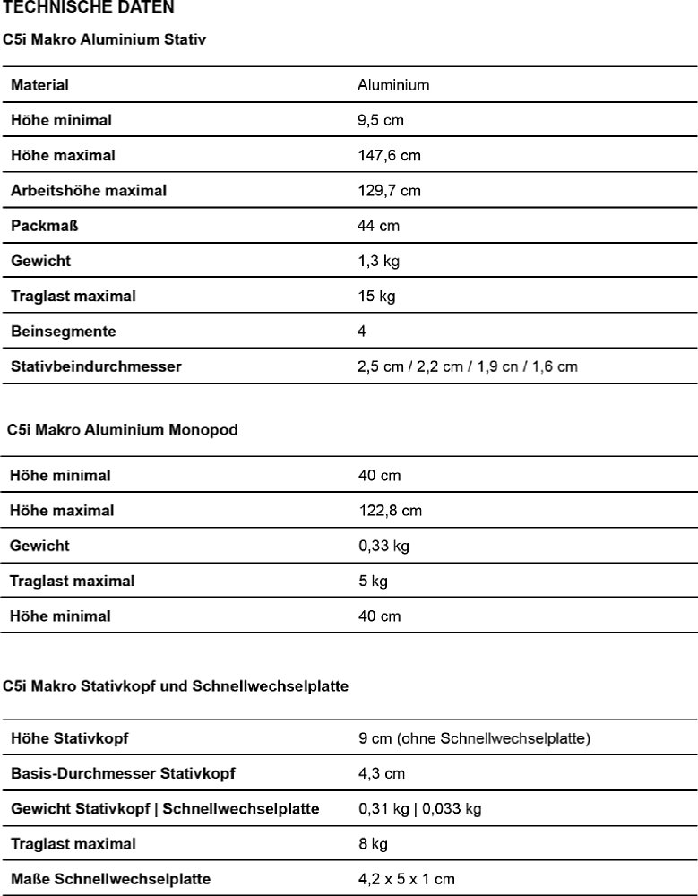 Falls der Bedarf nach einem Monopod besteht, kann das C5i Makro schnell zu einem Monopod mit einer maximalen Arbeitshöhe von 122,85 Zentimetern und einer Traglast von 5 Kilogramm umgebaut werden. Als dreibeiniges Stativ ermöglicht das C5i Makro eine maximale Arbeitshöhe von 129,7 Zentimetern und eine Traglast von maximal 15 Kilogramm, welche auf den drei Beinen mit jeweils vier Beinsegmenten verteilt wird.