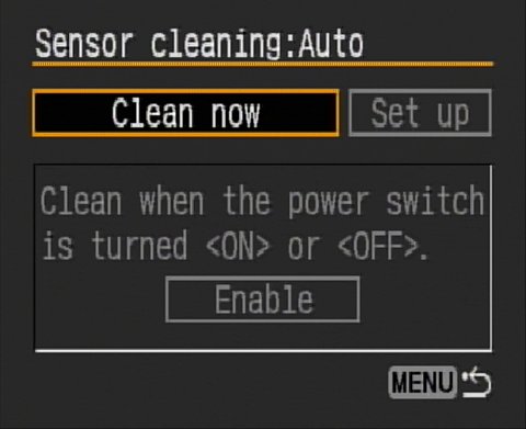 Sollten trotz all dieser und anderer Maßnahmen (u. a. soll noch eine spezielle Gummidichtung auf mittlerer Ebene das weitere Vordringen von Staub verhindern und eine Auffangvorrichtung dafür sorgen, dass der abgeschüttelte Staub "gefangen" bleibt) noch Staubteilchen auf dem Sensor verbleiben, hat der Benutzer zwei Möglichkeiten, dem Staub den Garaus zu machen. Die "radikale" Methode besteht darin, die manuelle Sensorreinigung im Einstellungsmenü der Kamera aufzurufen, bei der für die Dauer des Reinigungsvorgangs der Verschluss geöffnet und der Spiegel hochgeklappt bleiben. Mit geeignetem "Putzzeug" kann man dann die Sensor- bzw. Tiefpassfilter-Oberfläche behutsam säubern; spezielle Reinigungskits gibt es im Zubehörhandel. Wer sich diesen nicht ganz risikofreien Putzvorgang (bei unsachgemäßer Behandlung kann im schlimmsten Fall der Tiefpassfilter verkratzen) nicht zutraut, kann das Problem auch softwaremäßig lösen. Dazu schießt man eine Art "Referenzbild" des Staubes (vorzugsweise durch Fotografieren einer weißen, uniformen Fläche bei einer Brennweite von mindestens 50 mm, einem Abstand von 20 bis 30 cm und dem Fokus auf Unendlich), das allen späteren Aufnahmen systematisch angehängt wird. Die entsprechende Datei ist nur ein paar Kilobytes groß und macht sich so kaum bemerkbar; die mitgelieferte Digital-Photo-Professional-Software kann die vom Staub verursachten Bildfehler (meist schwarze Punkte oder graue Flecken auf den Bildern) dann auf dem Computer nachträglich aus den Bildern herausrechnen.
