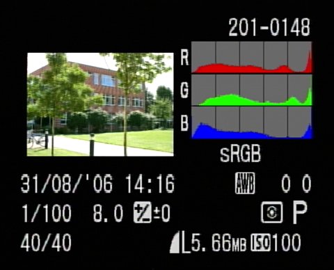 Die radikalste Änderung gegenüber der EOS 350D betrifft aber das Bedienkonzept. Die gesamte Kamerasteuerung erfolgt nun direkt über den 6,3 cm großen Farbbildschirm (2,5"-TFT-LCD mit 230.000 Bildpunkten), der im Vergleich zum 1,8"-Farb-LCD der EOS 350D einfach riesig aussieht und dem die kleine monochrome Flüssigkristallanzeige der 350D oberhalb des Monitors zum Opfer fiel. Dafür muss der Monitor der EOS 400D jetzt aber auch die Funktion des Statusdisplays übernehmen. So bleibt der Bildschirm nach dem Einschalten der Kamera zunächst einmal permanent eingeschaltet und zeigt die wichtigsten Kameraeinstellungen und Informationen wie z. B. die geschätzte Restbildzahl, die eingestellte Bildqualität (Auflösung/Komprimierung), ggf. eingegebene Belichtungskorrekturen, die Belichtungswerte (Verschlusszeit und Blende) usw. an, die bei der EOS 350D z. T. auf dem Statusdisplay angezeigt wurden. Die Anzeige der Einstellungen und Informationen erfolgt dabei schön groß und übersichtlich in schwarzer Schrift auf grau-weißem Hintergrund, was zwar ein bisschen trist aussieht, aber an Lesbarkeit kaum zu überbieten ist. Überhaupt ist der LC-Bildschirm der EOS 400D auf gute Lesbarkeit getrimmt. Der Betrachtungswinkel (160° h/v) ist doppelt so groß wie beim LCD der EOS 350D, und die Helligkeit ist laut Canon um bis zu 40 % höher als bei den LCDs der EOS-1D Mark II N, EOS 5D und EOS 30D. Da aber eine zu hohe Bildschirmhelligkeit bei der Bildkontrolle im Wiedergabemodus bildverfälschend wirken kann, rät Canon dazu, die Helligkeit entsprechend einzustellen, wobei die EOS 400D jetzt 7 Helligkeitsstufen anbietet und ein Graukeil die optimale Anpassung der Bildschirmhelligkeit erleichtert.