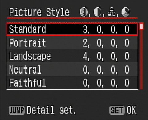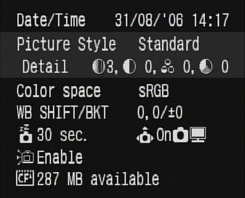 Mit den so genannten PictureStyles bietet die EOS 400D nun auch die von der EOS-1D Mark II N, EOS 5D und EOS 30D bekannten Bildparameter-Voreinstellungen. Die Bildschärfe, die Farbsättigung, der Bildkontrast, der Farbton und z. T. auch andere Parameter sind hier an verschiedene Aufnahmesituationen (z. B. Porträt, Landschaft, S/W-Aufnahmen) angepasst; drei Speicherplätze lassen benutzerdefinierte Bildparameter-Einstellungen zu, und gebrauchsfertige PictureStyles lassen sich bei Canon aus dem Internet herunterladen und in die Kamera einspielen. Die PictureStyle-Einstellungen lassen sich übrigens direkt über die Set-Taste mitten im Navigationsfeld (die sich auch anders belegen lassen kann) abrufen, wobei man aber merkwürdigerweise nur von einer Einstellung zur nächsten springen kann. Im Gegensatz zu anderen Einstellungen (wie z. B. bei der Wahl der Lichtempfindlichkeitsstufe) kann man den Cursor nicht horizontal bewegen, und auch, wenn das ein Detail ist, kann man nur hoffen, dass Canon das irgendwann einmal bei einem Firmware-Updates behebt.
